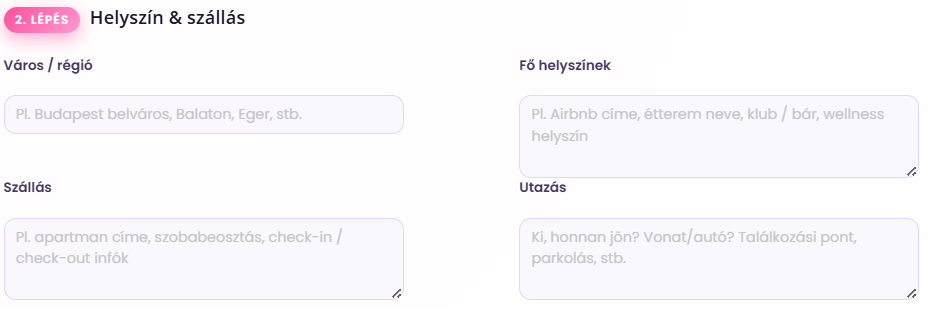- Fő helyszínek – Airbnb címe, étterem, bár, klub, wellness, programok helyei.