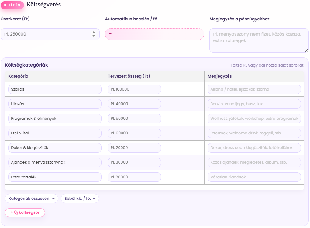 Szállás, utazás, programok, étel & ital, dekor, ajándék, tartalék.